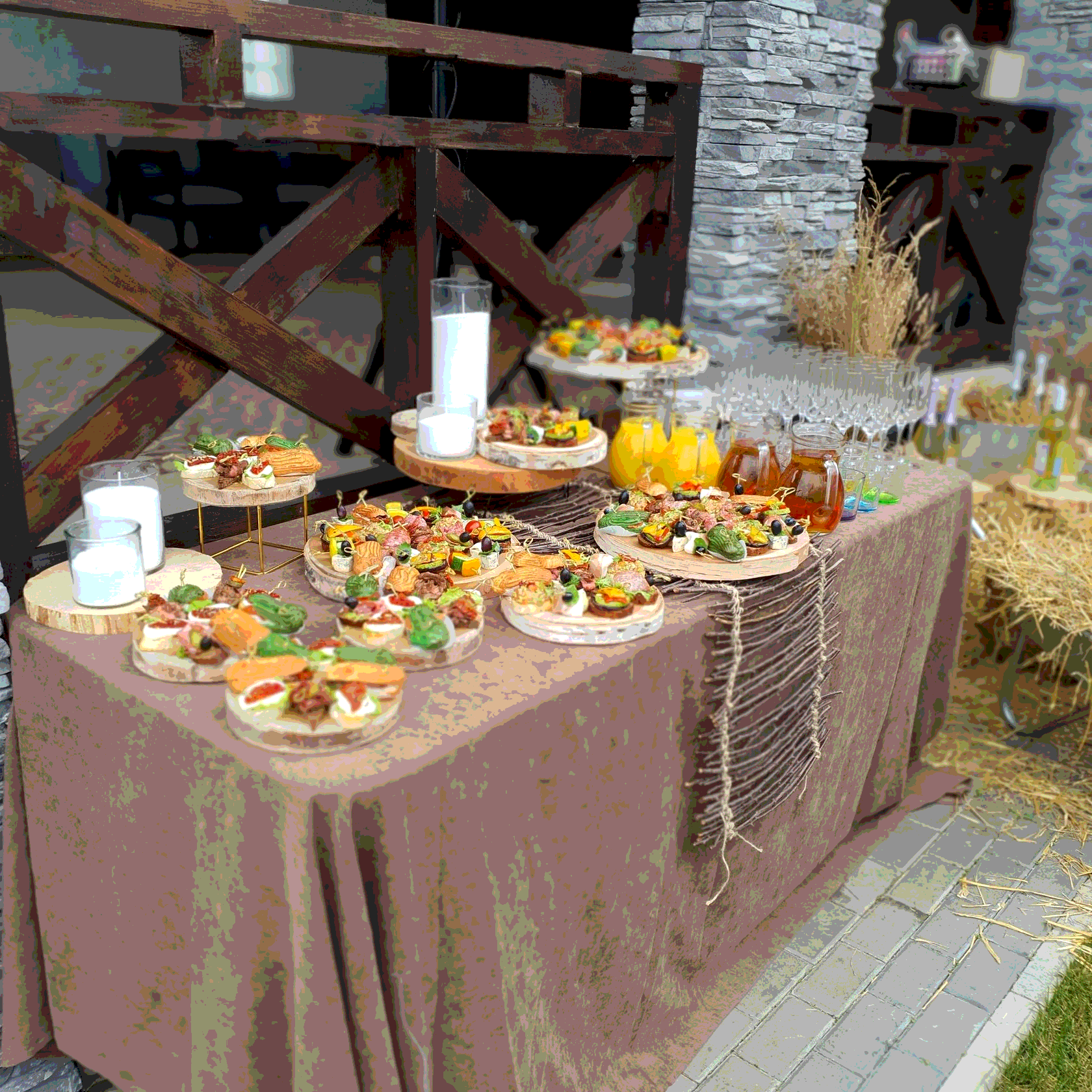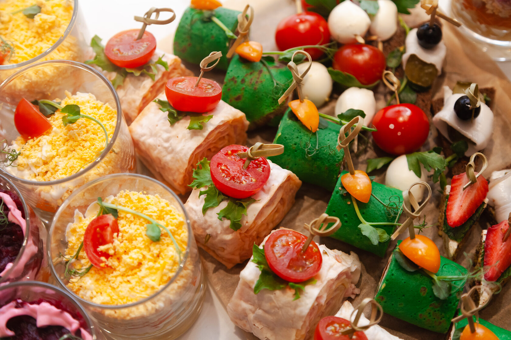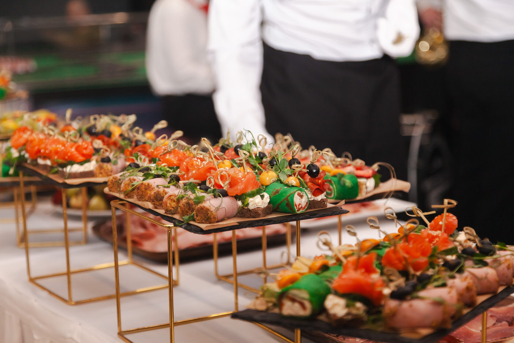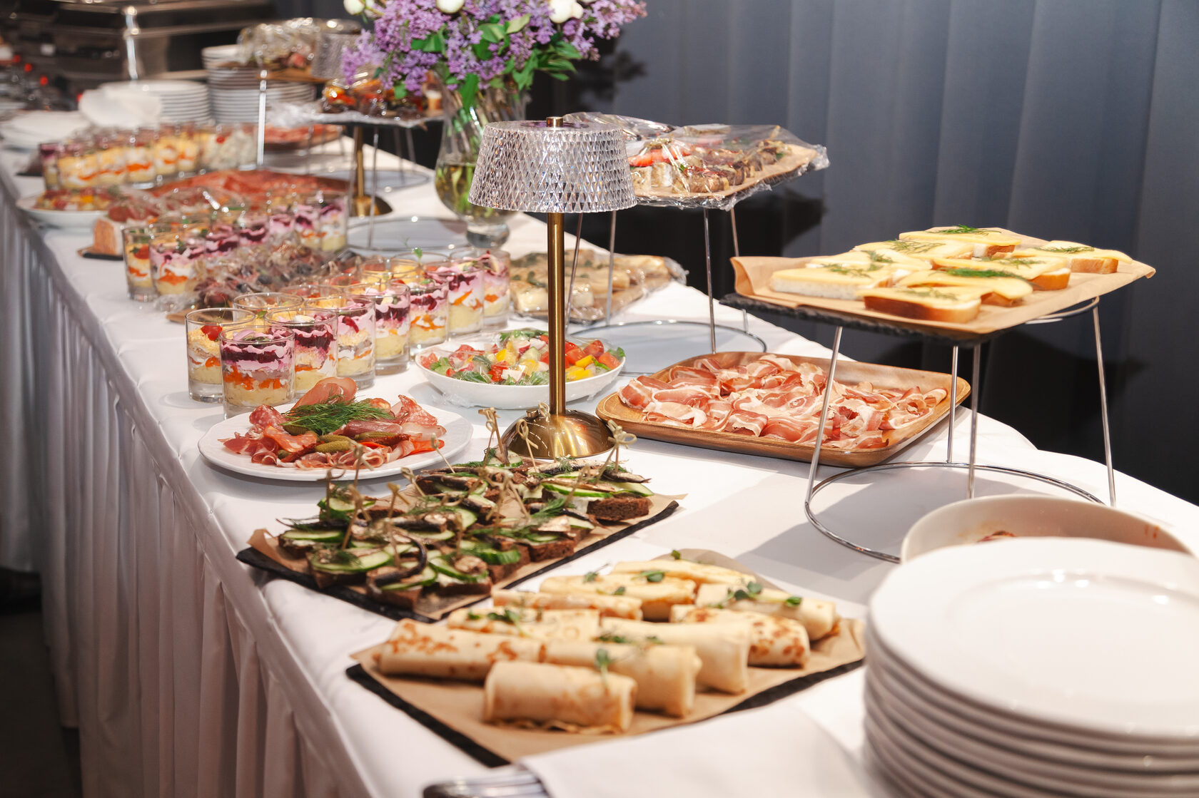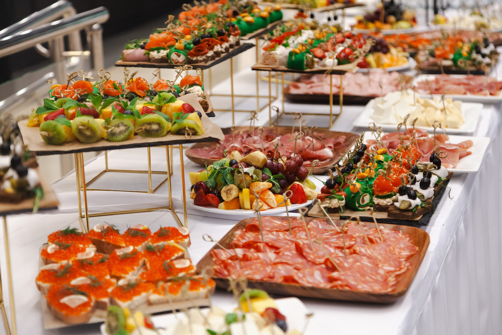 Что входит в фуршет: • Фуршетные закуски (канапе, роллы, тарталетки) • Горячие блюда на шпажках или в порциях • Напитки (безалкогольный бар) • Десерты и фрукты • Доставка или обслуживание на площадке